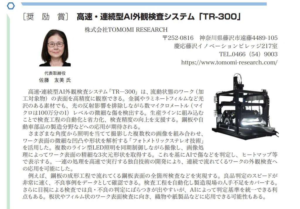 光沢素材の微細傷を流れるラインで検出するAI外観検査「TR-300」が奨励賞を受賞しました