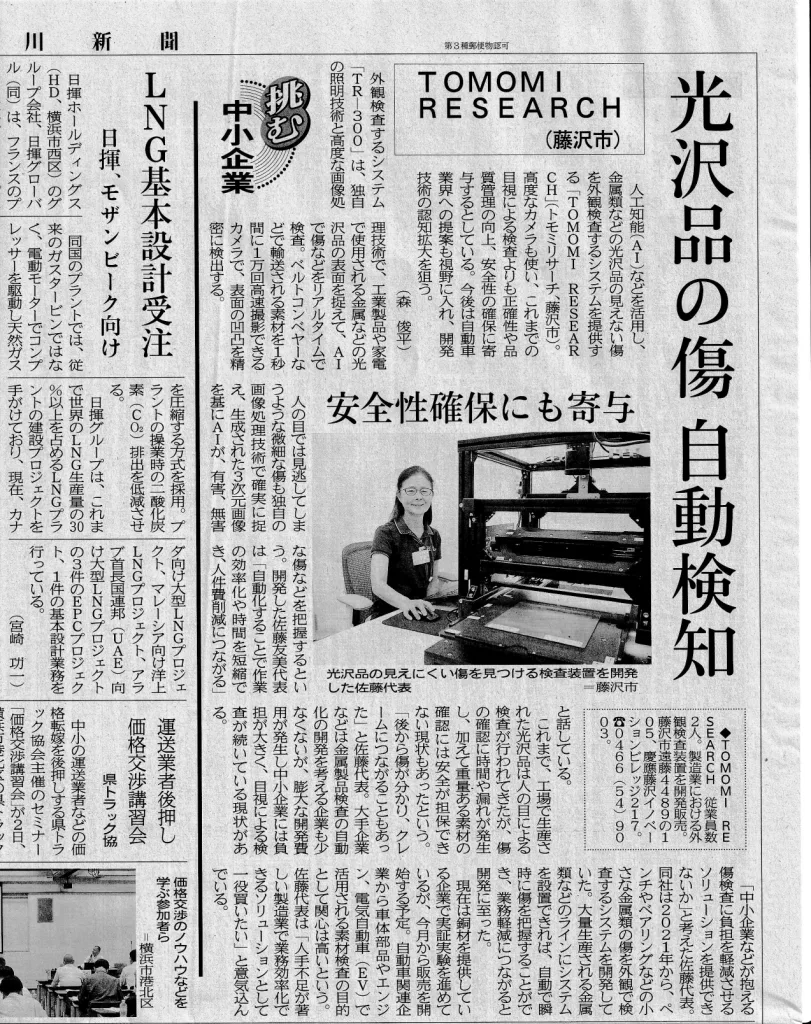 神奈川新聞掲載:光沢製品と高速検査に特化した「TR-300」 2024年10月3日付の神奈川新聞にて、TOMOMI RESEARCHの佐藤友美CEO(工学博士)が、当社の革新的な外観検査システム「TR-300」についてイ […]